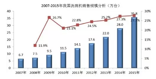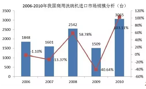 2006年我國商用洗碗機市場規模為1.89萬臺,2007年達到2.52萬臺,同比增長33.33%,2008年為2.80萬臺,同比增長率為11.11%,2009年為3.29萬臺,同比增長率為17.65%,2010年為4.70萬臺,同比增長率為42.86%。預計到2015年,我國洗碗機的銷售規模將達到35.8萬臺。