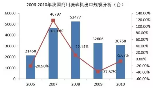 2006年我國商用洗碗機出口規模達到21458臺,2007年我國商用洗碗機出口為46797臺,同比增長率達到118.09%,2008年達到達到52477臺,同比增長幅度有一定的下降,2009年、2010年因金融危機的影響,我國商用洗碗機的出口量有較大幅度的下降,分別為32606臺、30758臺,下降比例分別為37.87%、5.67%。