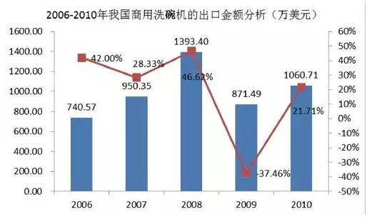 2006年我國商用洗碗機的出口金額為740.57萬美元,同比增長率達到42%,2007年為950.35萬美元,同比增長率為28.33%,金額的增長幅度較數量的增長幅度小很多,主要原因是商用洗碗機的出口單價從2006年的345美元/臺下降為203美元/臺。2008年出口金額為1393.40萬美元,同比增長46.62%,2010年出口金額有所回升,為1060.71萬美元,增長率為21.71%。