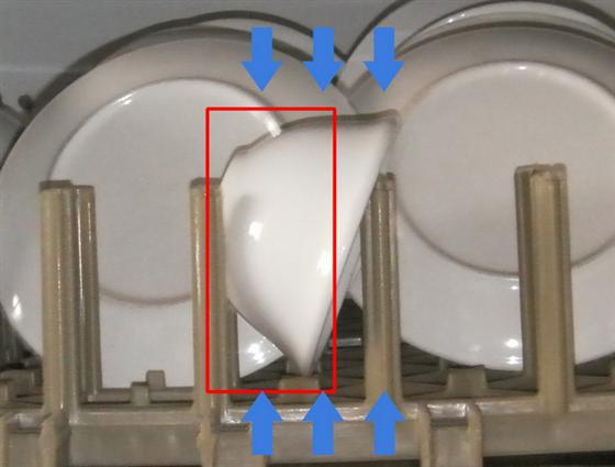 上圖所示我們可以看出:涂黑的部分是高壓噴淋沖不到的地方,還有A和B處也是無法沖洗到的,最多是其它地方的水淋上去的,“淋”與“噴”存在著根本的不同,噴是有壓力的,而淋是沒有壓力的,也就是此時沖刷餐具沒有壓力是無法確保完成噴淋沖刷動作的。因此是沒有壓力的,清洗出來的餐具最多只有85%的干凈。如果要想餐具清潔,他們在起初工作階段給洗碗工一定的好處,在上洗碗機之前來點小動作,先粗洗一下餐具,但在實際操作時根本不可能做到,所以餐具的干凈程度和人的工作質量有關,而不是靠洗碗機來保證了,因此高檔場所及要求較高的食堂、餐廳就要采用平放式洗碗機了。