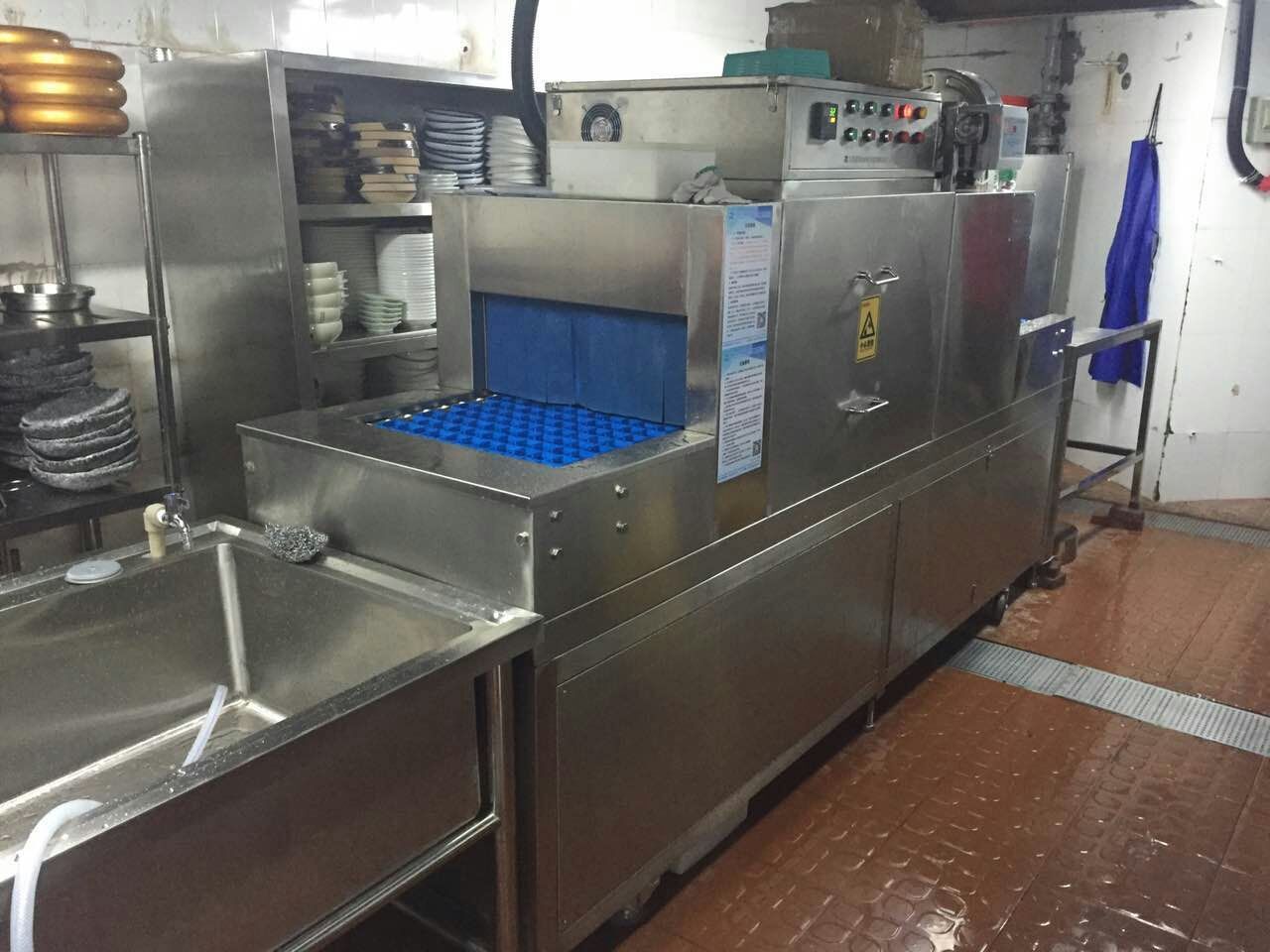 食堂用洗碗機的注意事項:食堂、餐廳用餐人數(shù)較多,正常的幾百到幾千人一起用餐。時間又很集中。所以餐具的清洗須在二到三小時內(nèi)將用餐的餐具要清洗結(jié)束。因此,一般使用洗碗機流水線,餐具不用裝框,直接擺放在傳送帶上,自動完成除渣、清洗、消毒等工序。