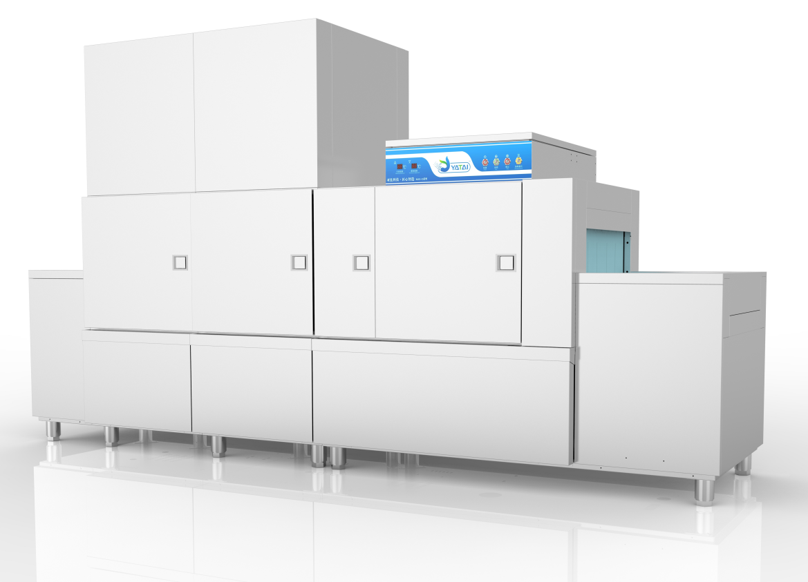 通道洗碗機配合洗碗機輸入輸出工作臺,餐具進入專用洗滌籃,進入機器洗滌室,通過傳輸軌道驅動洗滌籃自動傳輸,經過預洗、主洗、漂洗、干燥程序360°無死角高溫高壓清洗,達到清洗消毒的目的。通道式洗碗機(籃筐大小有標準式和非標準式兩種)。這種洗碗機最大的特點是可以清洗各種款式和不規則的餐具,主要用于酒店、學校和政府機構的食堂。